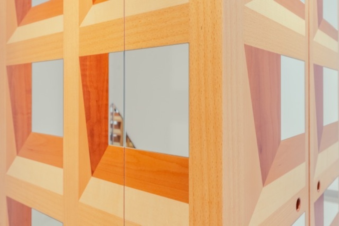 One of the most striking elements of the show is how much of the work blurs boundaries between art, design, and architecture. Furniture doubles as sculpture. Columns open into drawers. Boxes morph into illusions through a single added mirror. Even their “ruler of horns”, a linear artwork constructed from architectural theory terms, is simultaneously a measuring device, a conceptual joke, and an aesthetic statement.