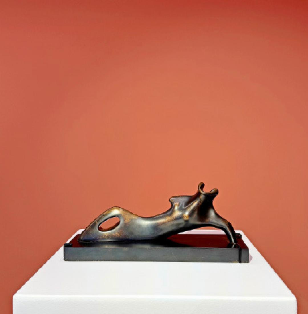 The exhibition features small bronze sculptures, copper pieces, and lithographs in both black and white and color, highlighting Moore’s innovative approach to sculptural practice and his interest in the human figure and natural forms.